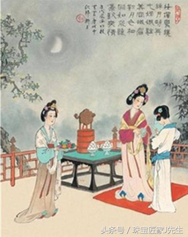 即少女相聚一起拜月祈愿,以求天赐良缘。