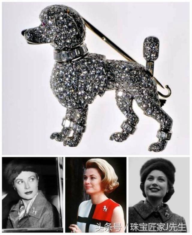 摩纳哥最美丽的王妃葛莉丝凯莉(Grace Kelly)拥有一只名叫奥利佛(Oliver)的贵宾犬,身为爱犬人士,她在1958年向Cartier订购了一只贵宾犬钻石胸针,用270颗钻石镶嵌在铂金中制成,这只胸针是王妃最珍爱的几件珠宝之一,佩戴在各种场合中。