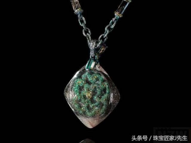 仔细观察你会发现,在完整的发晶中间镶嵌一颗钻石,围绕这个钻石又会蔓延出密镶的祖母绿,这些祖母绿最终连结成翠绿的祥云,金色的发丝交错掩映。