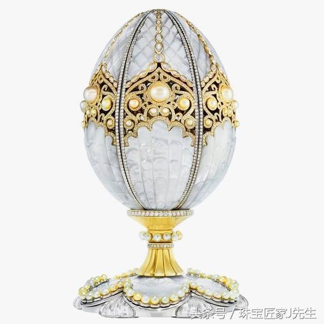 这枚白色彩蛋由 Fabergé 与珍珠收藏家族 Al-Fardan合作完成,共镶嵌139颗珍珠,外壳由珍珠母贝雕刻而成,细致的装饰了格纹状和羽毛状的肌理,并以小颗钻石点缀。