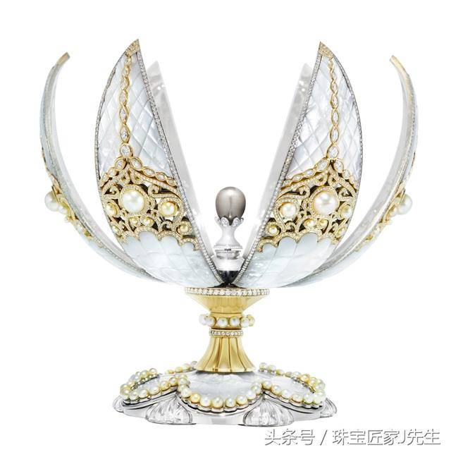 这枚彩蛋,从牡蛎中的珍珠获取灵感:打开彩蛋的六片花瓣状外壳,可以看到一枚12.17克拉的灰色珍珠置于其中。