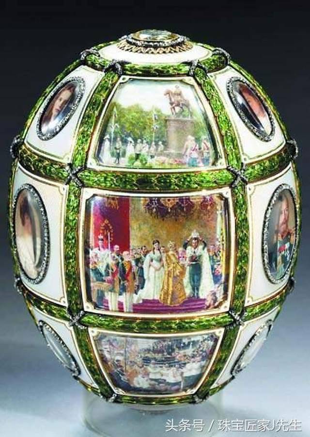 这是一枚值得唏嘘的彩蛋,彩蛋上,法贝热运用陶瓷、玻璃、钢铁、木材、小粒珍珠等材料,以绘画的形式展现了尼古拉二世的家庭成员及在位期间的事迹。