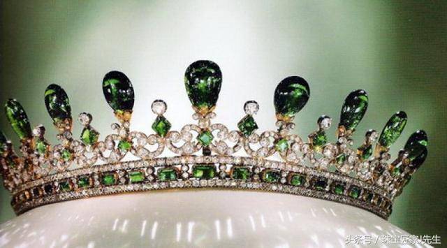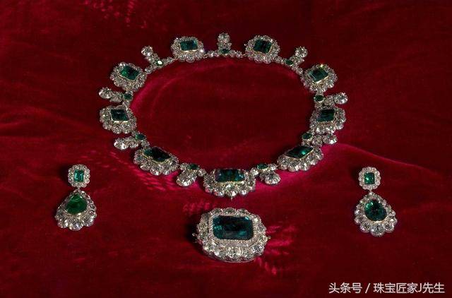 这套祖母绿珠宝套装有王冠、项链、耳坠和胸针四件:项链、胸针和耳坠制作于1843年,项链镶有9颗大尺寸的方形祖母绿,主石为一颗重达20ct的祖母绿;耳坠则是镶嵌水滴形祖母绿主石。