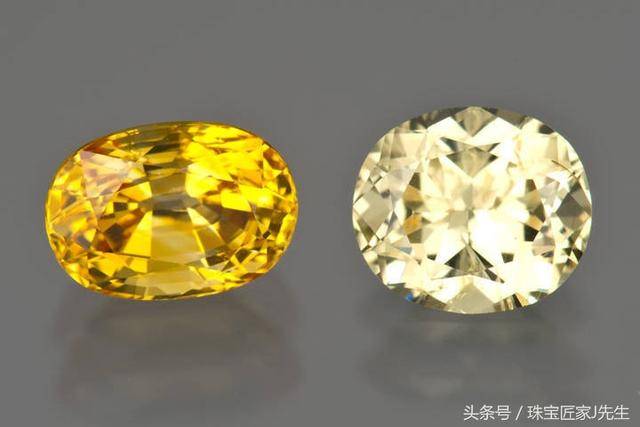 左:加热金黄色蓝宝石 · 右:天然加热浅黄色蓝宝石 · 图片来自GIA