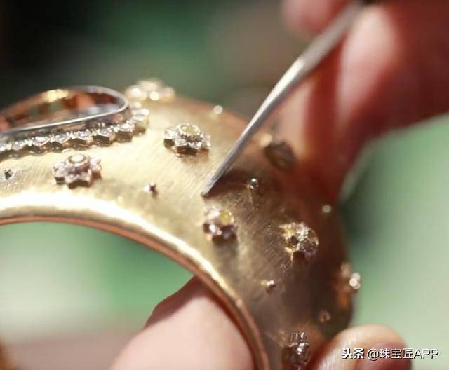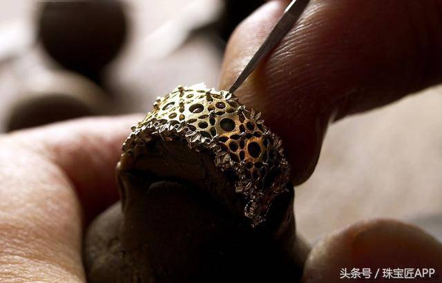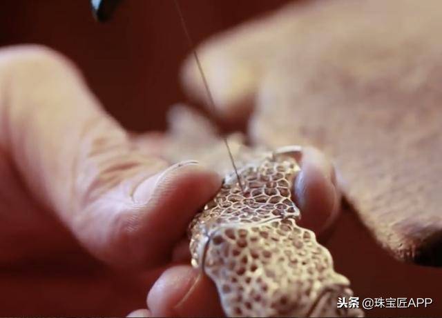 手艺娴熟的工匠们通过娴熟的工艺,在饰品表面准确的镂刻出六边形,以形成珠宝表面上致密的网纹,最后在网纹中嵌入宝石。