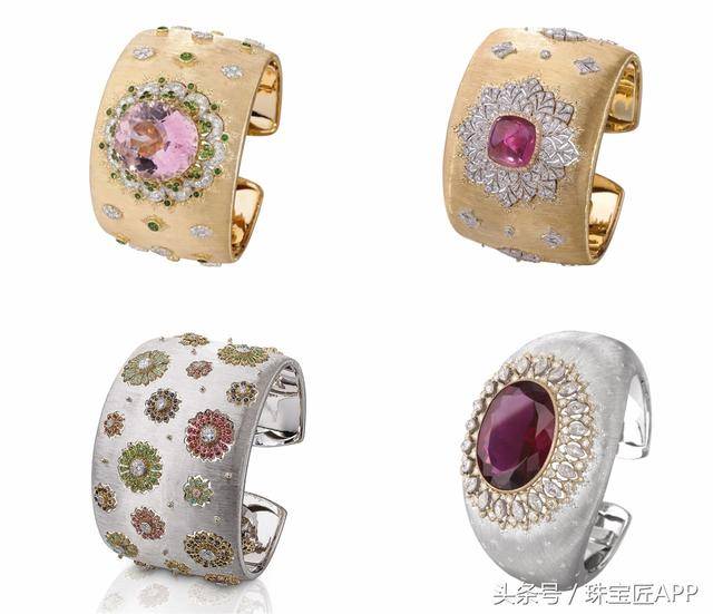 在细节处理上,布契拉提的工匠们还常使用Riato(边缘切割纹理)、Telato(金丝螺旋)、Ornato(金属微雕)等,刻刀在金属上刻画出美丽的花纹,让整件首饰细节丰满精致。