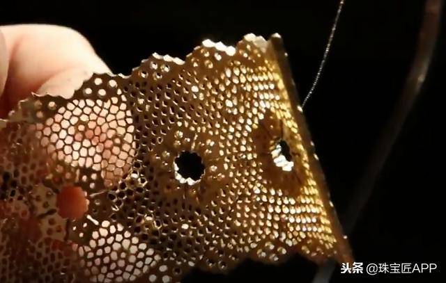 这种工艺要求工匠先在金片上凿出小孔,再用极细的金属线穿过小孔,通过反复摩擦,以镂刻出精细的蜂巢形状;