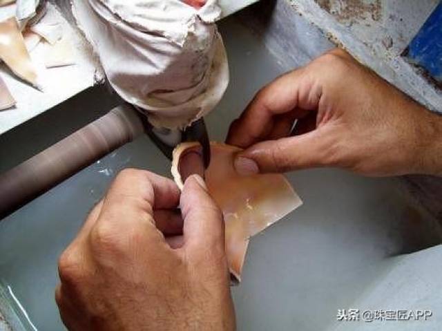 以海螺Cameo为例,Cameo的雕刻需要很多道工序,首先是海螺的筛选,师傅们要从大量的海螺中选取适宜雕刻的海螺,并进行切割;