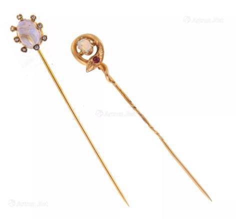 蛇形 蛋白石 红宝石 黄金帽针&月光石浮雕 黄金帽针 (两件)