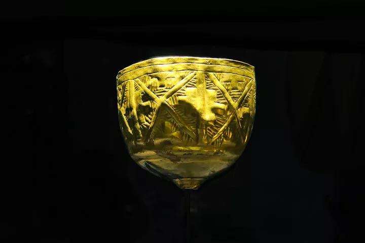 几何纹金杯上面的纹饰,形似汉字“凸”,又叫阶梯纹,最早在7000年前出现,常见于中亚和近东。