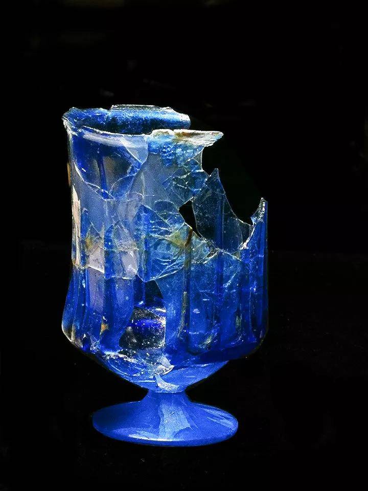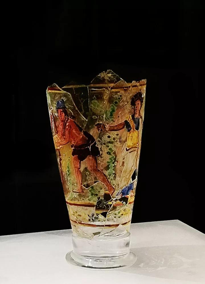 上面这件彩绘玻璃杯,描述的是收获枣椰的过程,从人物的衣饰看,图中女子的地位要高于男子。近