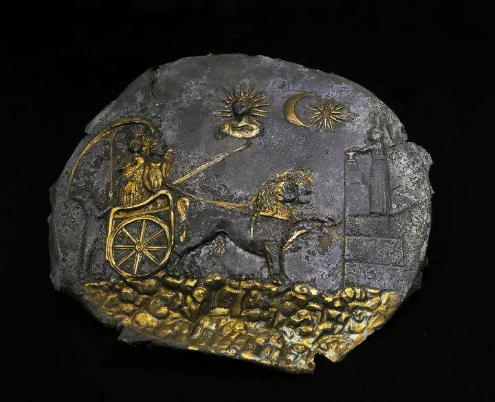 上面这件二神架车图像饰板:头戴波洛斯(Polos)王冠西布莉,是自然女神;西布莉旁边长有双翼,驾车的是胜利女神妮可(Nike);天上的是太阳神赫利俄斯。