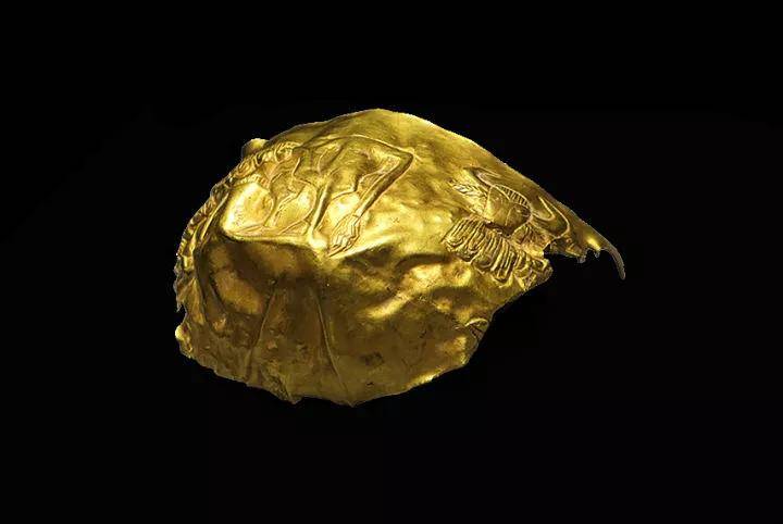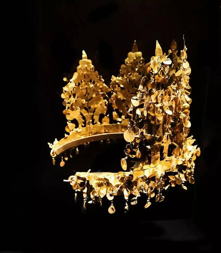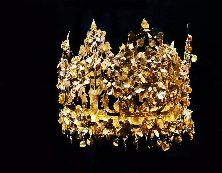 下面这顶王冠,是阿富汗标志性的文物,由六个组件构成。下面底沿是一条长带,上面有5个片状的镂空花形树,可以拆卸。