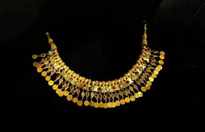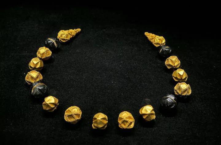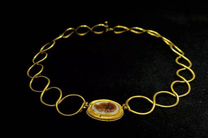 项链 正中镶嵌双色玛瑙坠饰,白色玛瑙上的褐色斑记被巧妙的雕成戴帽子的希腊-巴克特里亚人形象