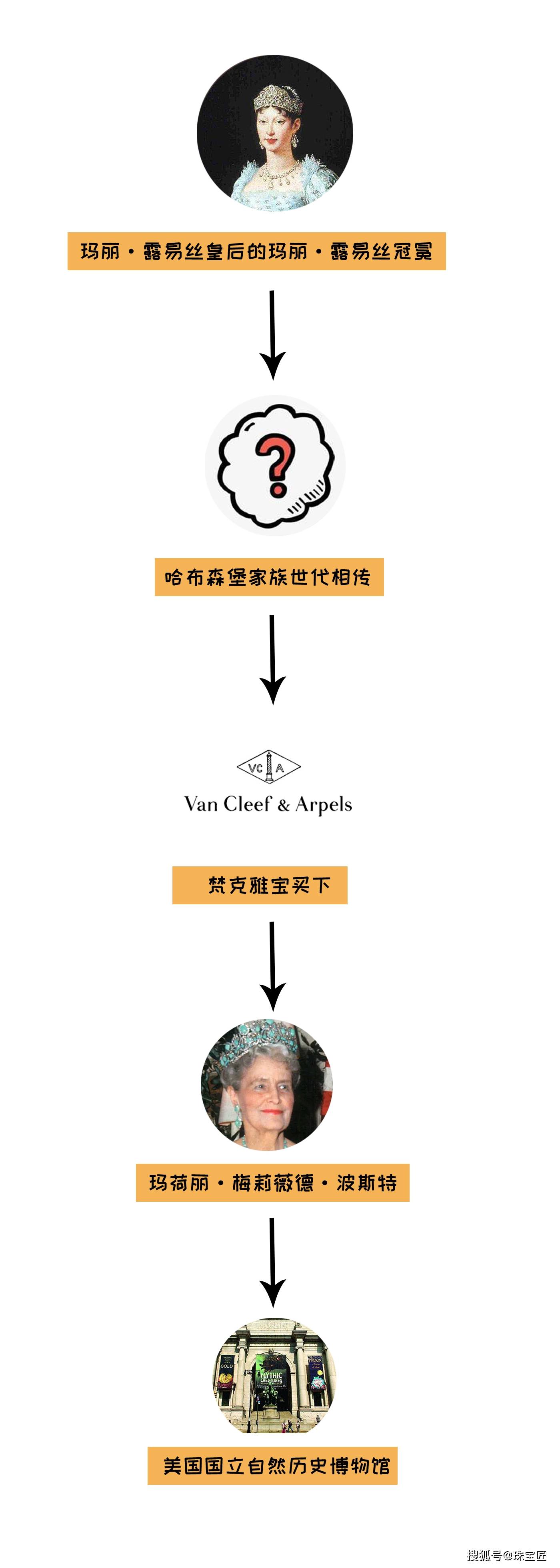 它是拿破仑送给第二任妻子玛丽·露易丝的礼物,后经梵克雅宝改造,被20世纪美国最有钱的女人:玛荷丽·梅莉薇德·波斯特收入囊中,如今这顶冠冕正安然的躺在美国国家自然历史博物馆中。