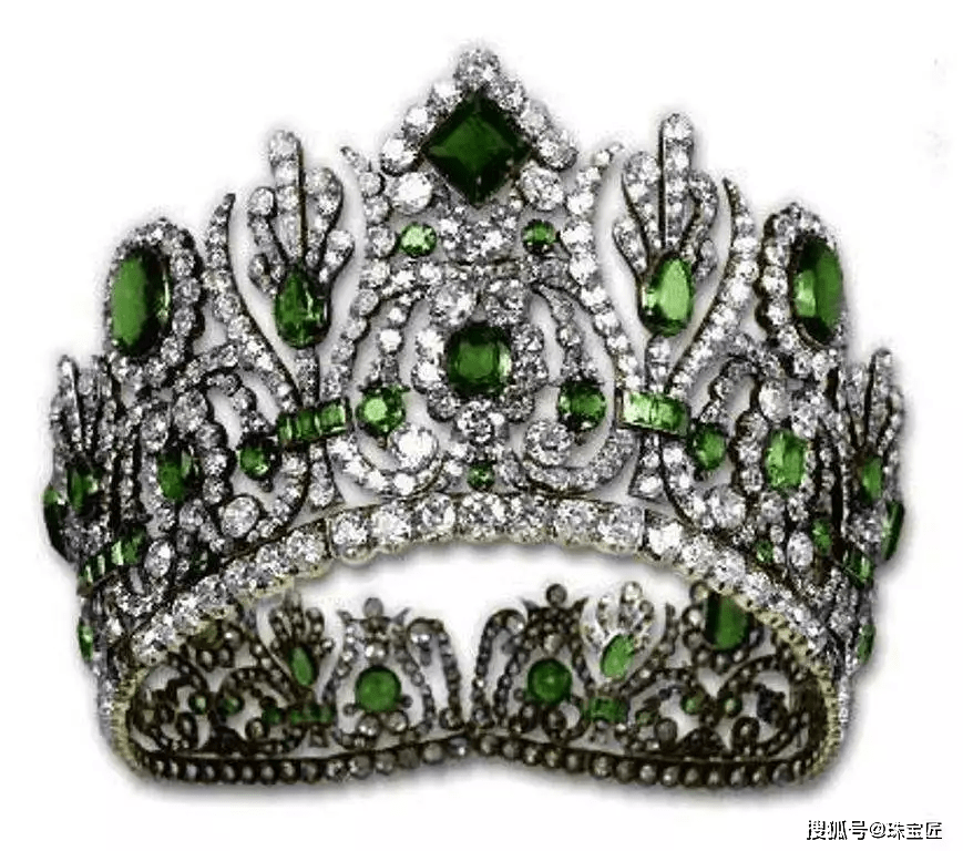 高贵大气的祖母绿,搭配明亮闪烁的钻石,款式新颖,样式精巧,工艺精湛,不仅成为了19世纪最为流行的冠冕款式之一,同时也代表了当时珠宝工艺的最高水平。