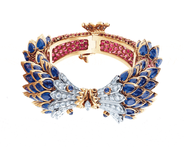 传奇设计师让·史隆伯杰的Blue Book系列,秉持一向的华丽风格,蓝宝石、尖晶石、钻石的巧妙搭配,呈现出双鱼接吻的造型,让人耳目一新。