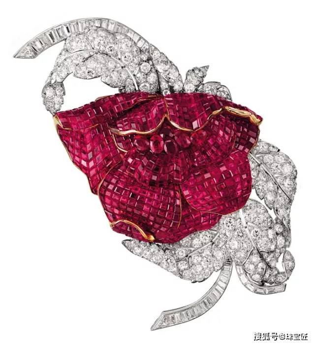 这枚采用梵克雅宝独创的隐秘式镶嵌的胸针,700多颗红宝石拼接成鲜艳的花瓣,在钻石枝叶的衬托下,光彩夺目。