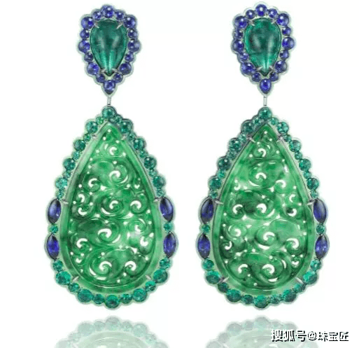 2017年时,国际珠宝大牌萧邦曾推出一款翡翠耳坠,如意纹翡翠雕片的运用,让首饰天然就打上了东方印记。蓝宝石和祖母绿的围边,又充满了西方设计师的风格,也算是可圈可点。