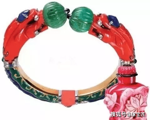 在20世纪东方风盛行的时候,卡地亚推出过一些具有东方特色的配色和设计,比如下面这款珊瑚祖母绿手镯。虽然红配绿是中国传统配色之一,但这个设计,着实有点让人难以恭维,貌似设计师对中国风有什么误解吧。