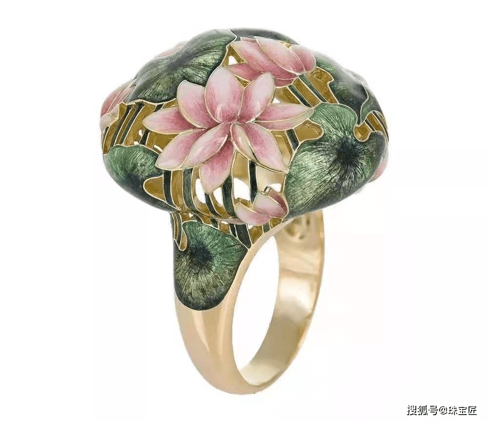 俄罗斯珠宝设计师llgiz Fazulzyanov 设计的这款以莲花为主题的戒指,设计师将手工金雕与彩色珐琅相结合,一朵朵淡粉色的莲花仿若在指尖绽放般,将莲花的典雅恬静展现得淋漓尽致。