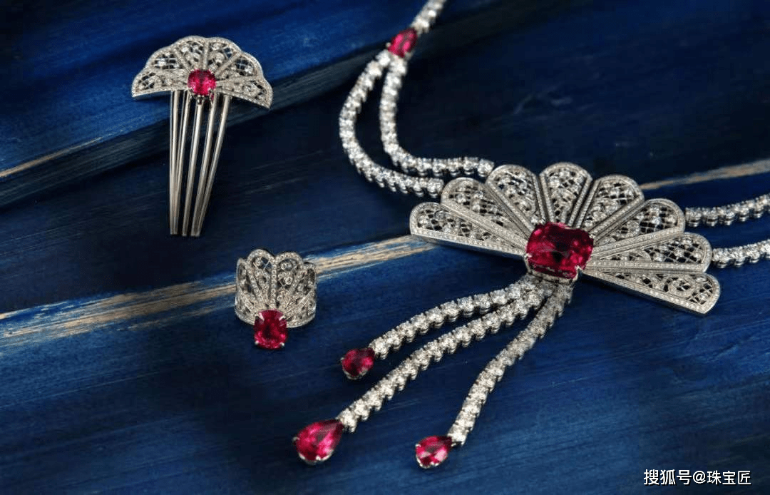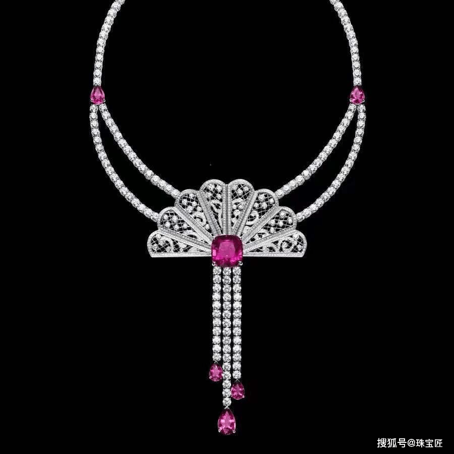 钻石镶嵌的镂空折扇,中间点缀了一颗红碧玺,下方悬挂的三条长短不一的钻石链条,彰显出高贵优雅。