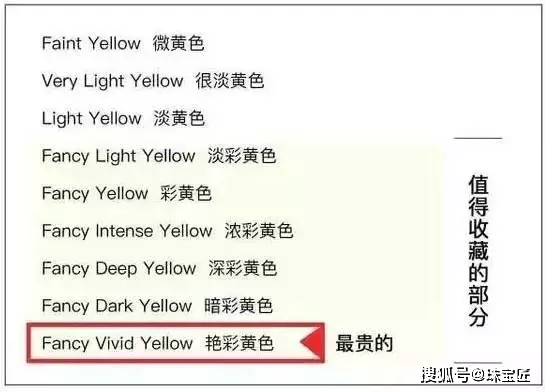 我们熟悉的彩钻色级是GIA采用特定的等级术语界定的,分为九个等级,一般建议至少要买Fancy Light Yellow以上,否则一眼看过去颜色基本看不出。