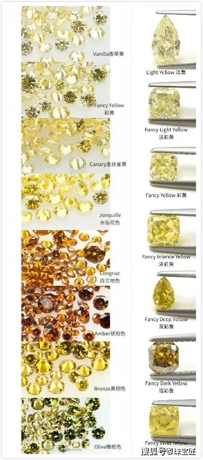除了GIA分级,不同珠宝商在商业上都有自己习惯的黄钻颜色名,商业名是根据自然界或生活接触的实物的颜色命名的。