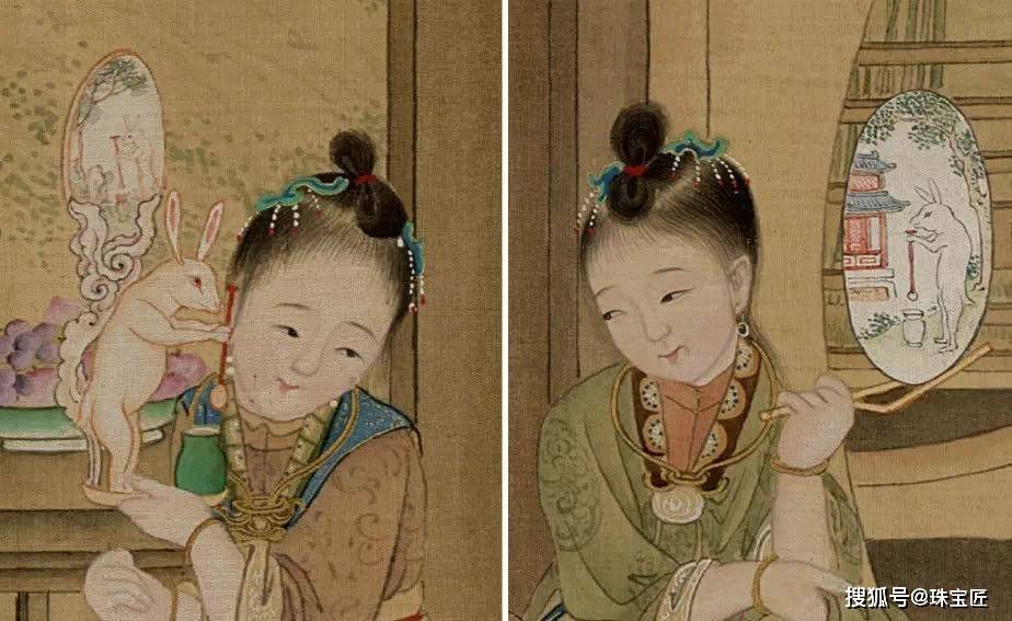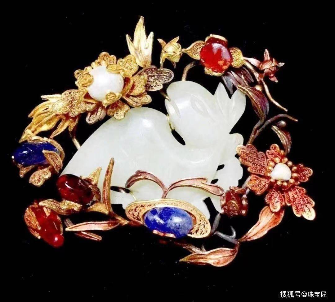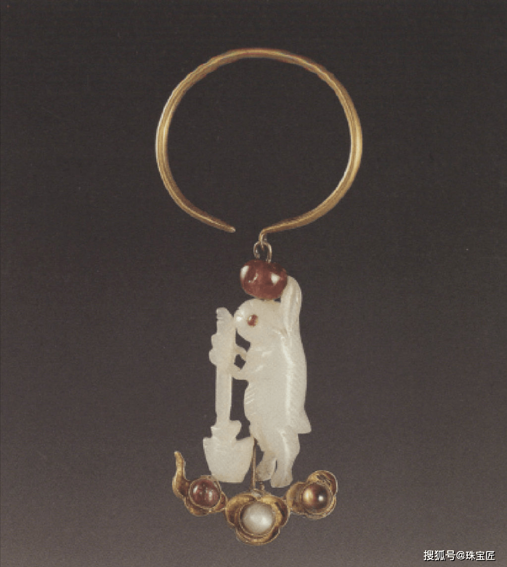 尤其是下面这款现藏于定陵博物馆的明代金环玉兔镶宝石耳坠,更是将玉兔捣药的形象立体化,并以红宝石、珍珠饰之,整体的造型生动形象,萌态十足。