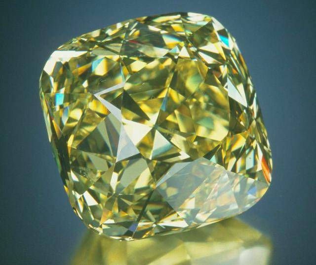 ↑↑↑101.29克拉,垫型切割,艳彩黄钻(Fancy vivid yellow),净度微瑕(VS2)。