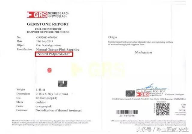 偏商业的国际鉴定机构,如GRS,对于达到帕德玛蓝宝石颜色标准的,则会注明Natural Padparadscha或Padparadscha Sapphire。
