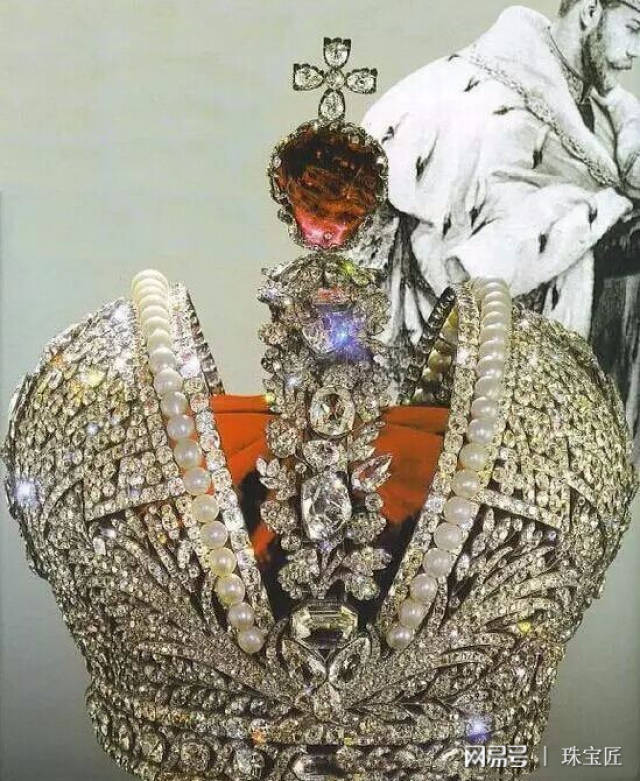 1762年,叶卡捷琳娜二世为自己的加冕礼请来了天才的宫廷珠宝匠制作皇冠,这顶皇冠上总共镶嵌了2858克拉重的4836颗钻石,其中装饰冠顶的是堪称世界上最大的红色尖晶石,重约398.72克拉,被列为前苏联七大历史名钻之一。