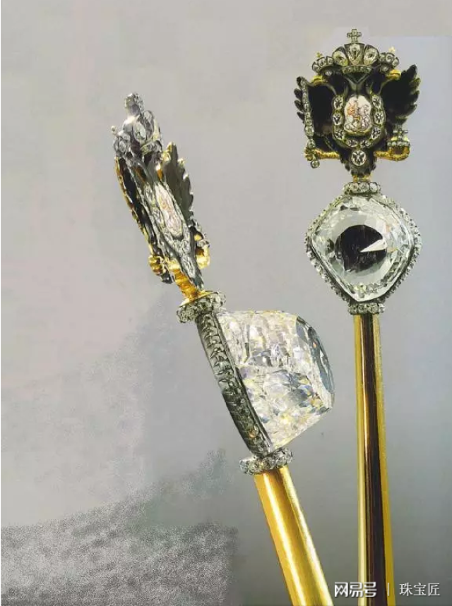 除了这顶闪瞎人眼的加冕皇冠,女皇叶卡捷琳娜还有一个镶嵌了世界第三大钻石“奥尔洛夫钻”,象征王权的权杖。