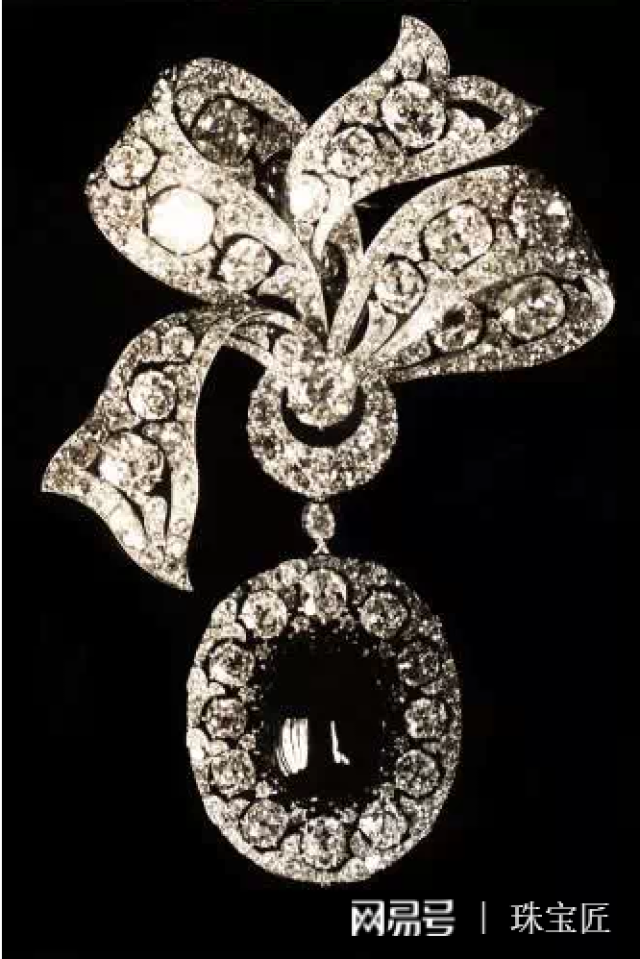 由于女皇对蝴蝶结造型的珠宝情有独钟,许多首饰都是蝴蝶结造型。如图,这条蝴蝶结钻石项链是由27颗垫型切割的大钻石周围围绕一圈叶子形状小颗钻石构成。