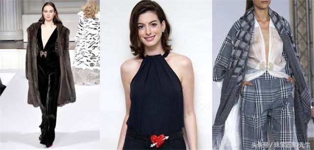 除了精巧型的胸针,不知怎么搭配的巨型胸针也可以用在腰部侧面的位置,甚至可以反常规的用链条串起来当做一条十分具有装饰性的腰带。