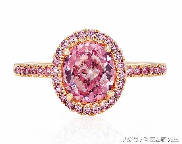 颜色浓郁的粉钻可以使用玫瑰金镶嵌,配以同色配石,视觉上会让主石显得更大。