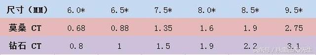由于密度不同,同等重量的莫桑钻看起来要比钻石大得多。重量与尺寸对比如下图: