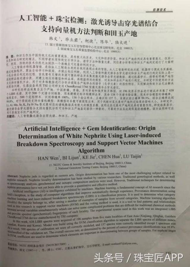 国家珠宝玉石质量监督检验中心(NGTC)成立了专门的科研组,针对广义和田玉的5个具体产地(新疆、青海、贵州罗甸、俄罗斯及韩国),采集了几百种样品数据,建立相应的模型和样品库,引进国际上最为先进的人工智能激光诱导击穿光谱对和田玉产地及真假皮进行检测。
