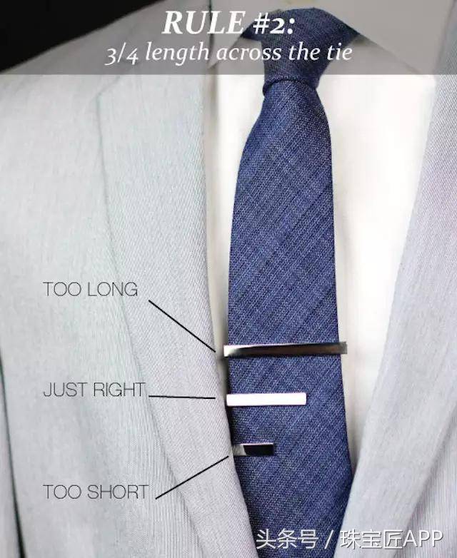 2.领带夹的正确佩戴:从上往下数,别在衬衫的第三与第四粒钮扣之间,还要同时将衬衫前襟夹进去,一般扣上西服从外面应当看不见或者稍许外露领带夹为佳。