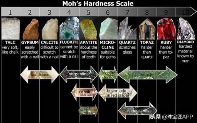 但是在珠宝界,宝石的硬度即摩氏硬度,即用“划痕法”,在测试矿物表面用棱锥形金刚钻针在表现进行刻划,用测得的划痕的深度分十个级别来表示矿物的相对硬度。