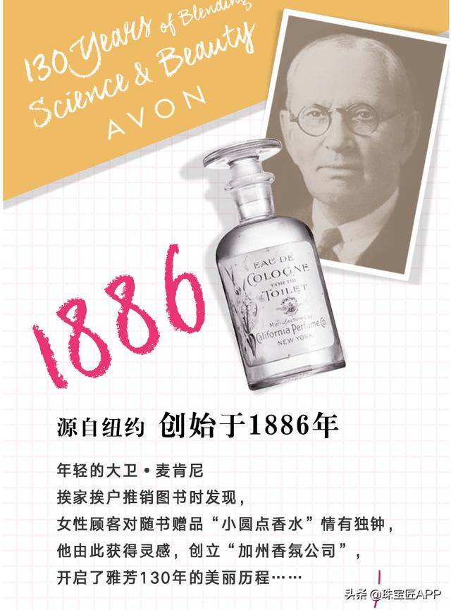 雅芳由David H McConnell始创于1886年,最早是个卖书刊的夫妻店。老板在上门推销书刊过程中发现主妇们不乐意他进入室内卖书,于是他灵机一动,卖书附赠香水,这一招果然换来了图书销量的增加。