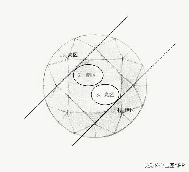 以钻石为例,可以简单分为四个区,亮区和暗区错落分布。其他宝石也是同理。
