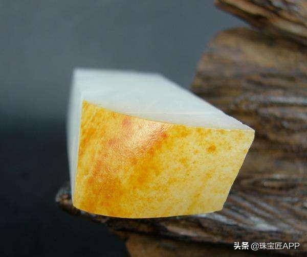 因为籽料皮色的形成是千万年微量元素持续沁染的结果,由表及里,如果剖开从侧面看,就能看出沁色不仅在玉石表面,在内部也有沁入,只是相比表面沁色更浅更疏松罢了。