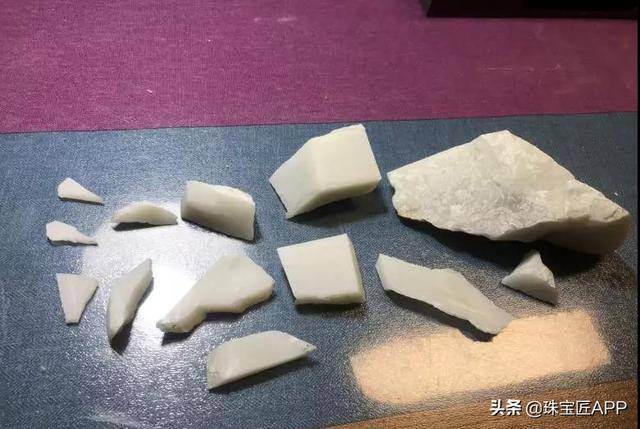 在切了好多刀之后,我把大大小小的碎料摆在桌子上,按着薄厚和大小摆了一摆,发现果然“返色”了。比较薄的那几块碎料明显比主体白了许多,厚一点儿的料隐约也白了几分。