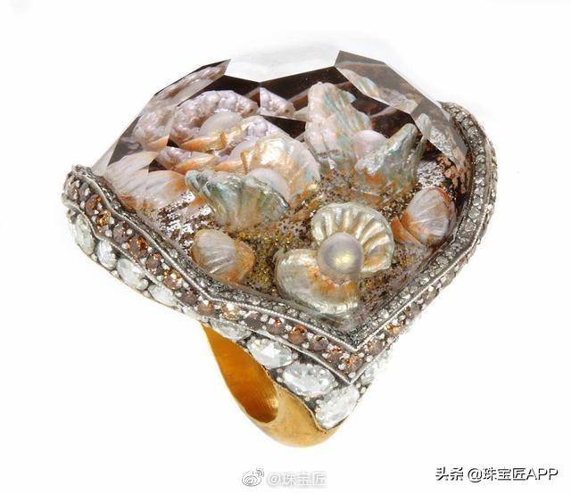 这是一款海底世界戒指,透过上面的水晶,我们能够看到一个奇妙的海底世界,有各种形状样式的贝壳,贝壳中间包裹着又大又美的珍珠,就连海底世界中的沙粒都雕刻的惟妙惟肖,仿佛戴上这枚戒指,就真的在海底畅游一般。