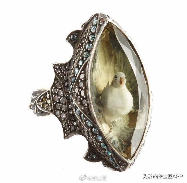 除了把海底世界放入到珠宝中,Sevan Biçakçi也将一些小动物雕刻在宝石中。这款鸽子戒指,主石选用的是柠檬黄的托帕石,通过托帕石,我们能够很清楚的看到鸽子的羽毛、眼睛和嘴巴,足以可见,设计师Sevan Biçakçi雕刻水平十分高超。