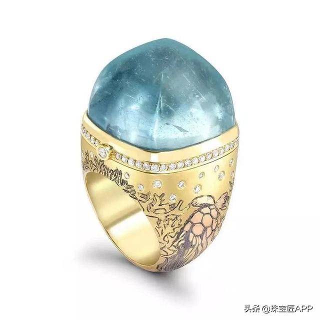 这个系列的戒指大部分选用的是碧玺、海蓝宝石、水晶等硬度较低,容易雕刻的主石,比如下面这一款。