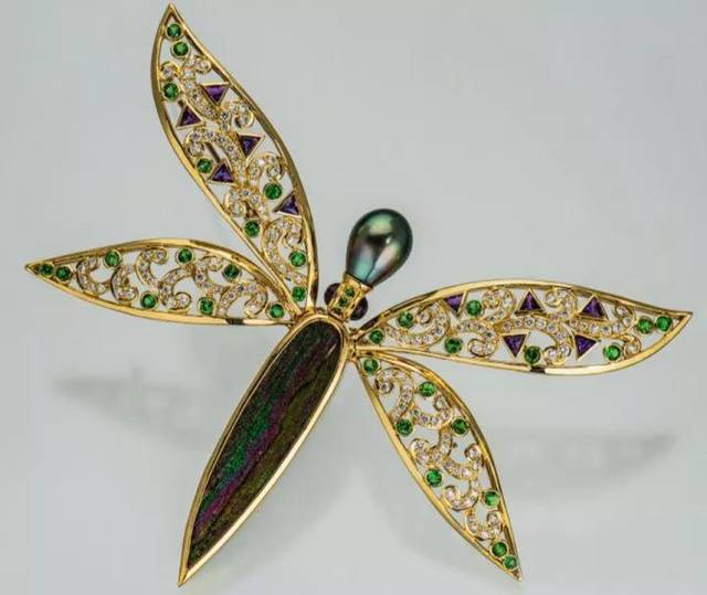 ↑↑↑这款蜻蜓胸针的身体是彩虹黄铁矿。由Paula Crevoshay友情提供。