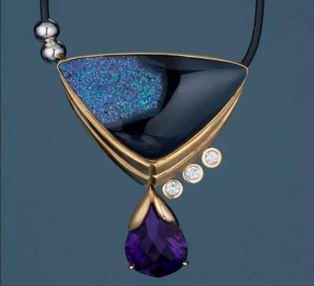 ↑↑↑这条项链镶嵌着钛镀层晶簇与紫水晶吊坠,并饰有钻石。这些宝石由 Steve Walters(史蒂夫·沃尔特斯)切磨,由 Nancy Knott & Co. 友情提供。摄影:Robert Weldon(罗伯特·韦尔登)/GIA