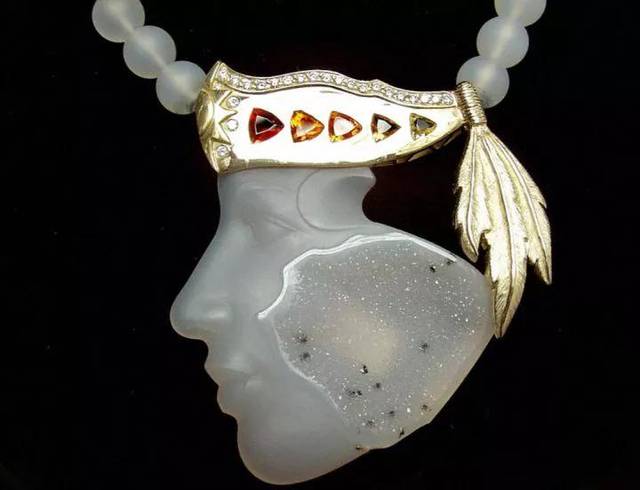 ↑↑↑由 Tom McPhee(汤姆·麦克菲)采用晶簇玛瑙和钻石打造,且头带上用黄金镶嵌锰铝榴石。由 North American Gem Carvers 友情提供。摄影:Robert Weldon(罗伯特·韦尔登)/GIA